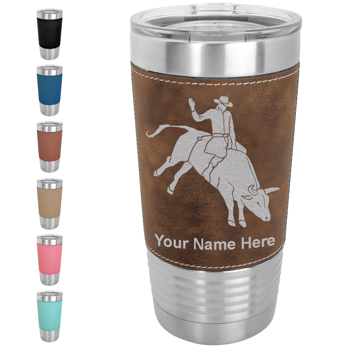 20oz Faux Leather Tumbler Mug, Bull Rider Cowboy, Personalized Engraving Included