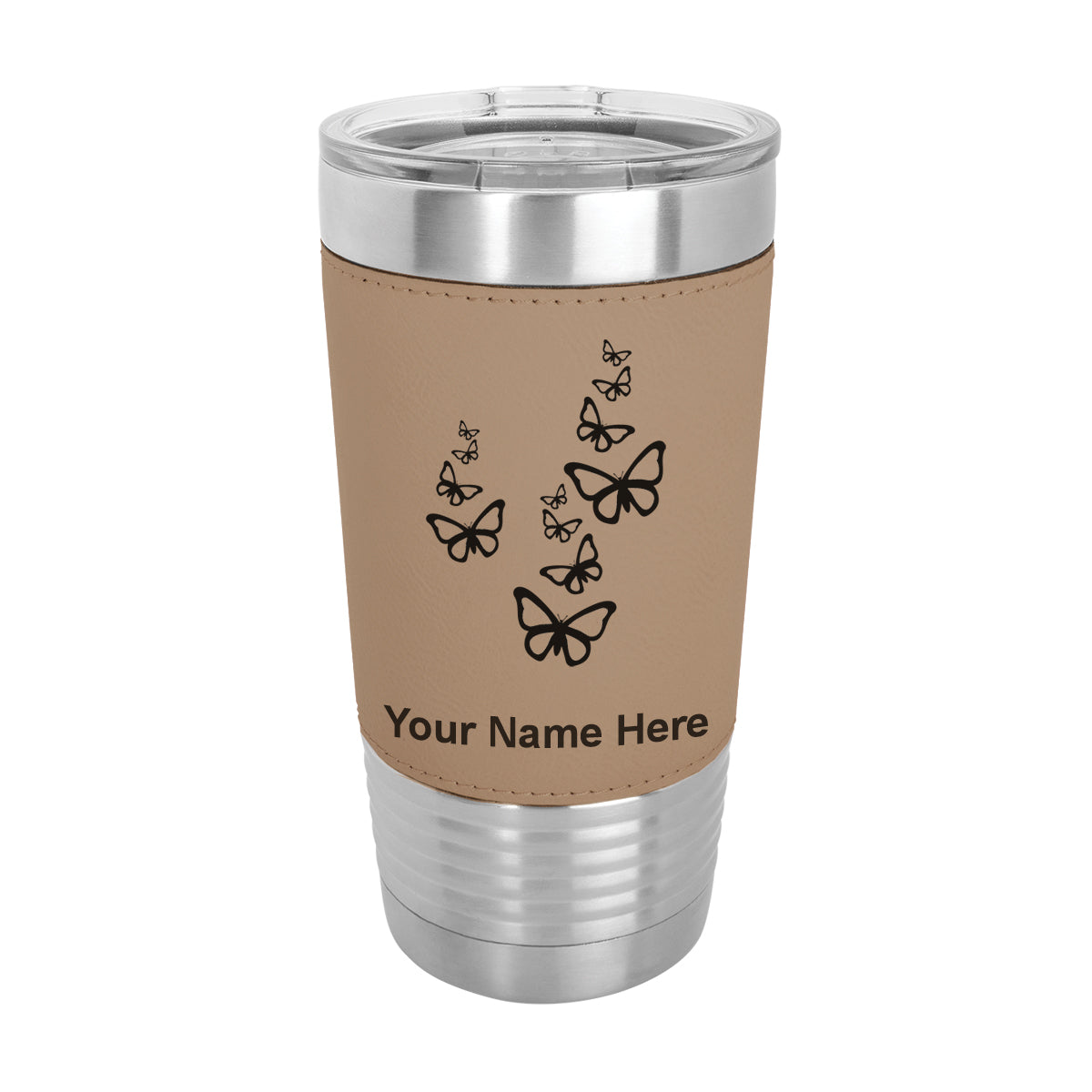 20oz Faux Leather Tumbler Mug, Butterflies, Personalized Engraving Included