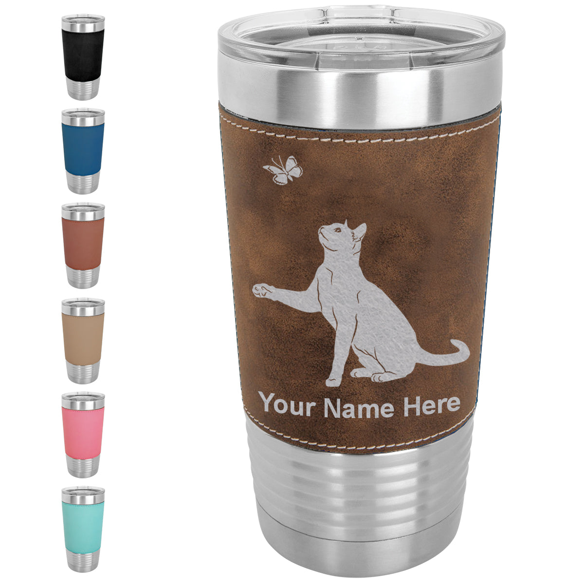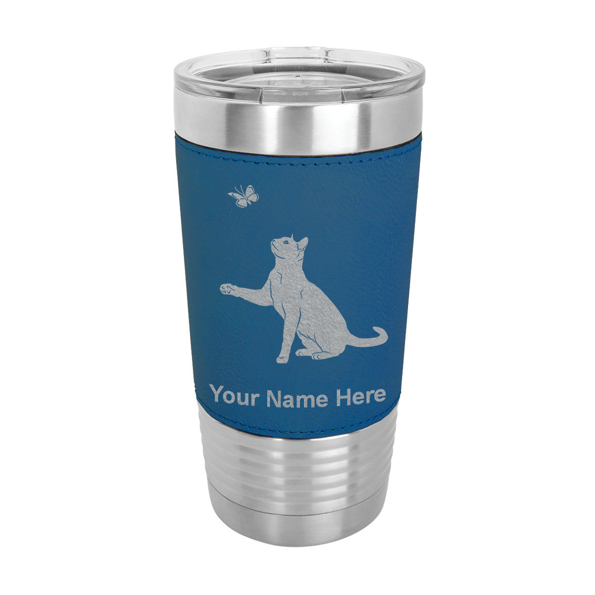 20oz Faux Leather Tumbler Mug, Cat with Butterfly, Personalized Engraving Included