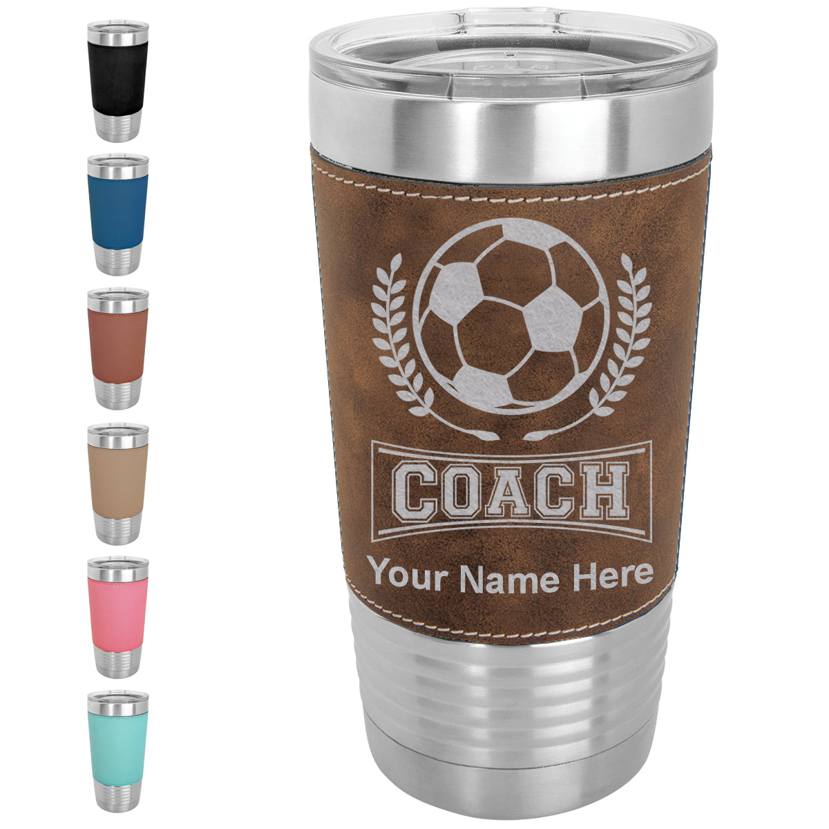 20oz Faux Leather Tumbler Mug, Soccer Coach, Personalized Engraving Included