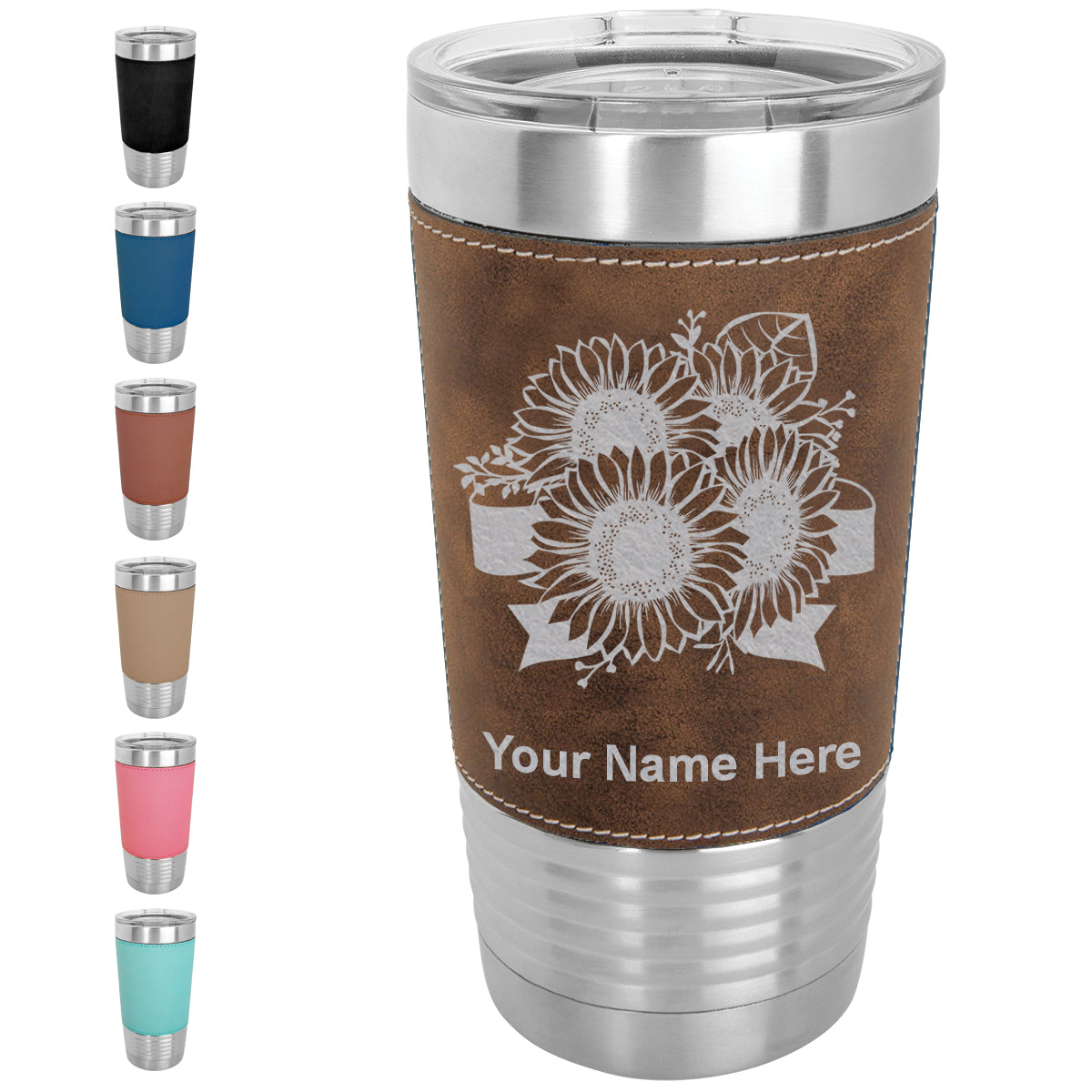 20oz Faux Leather Tumbler Mug, Sunflowers, Personalized Engraving Included