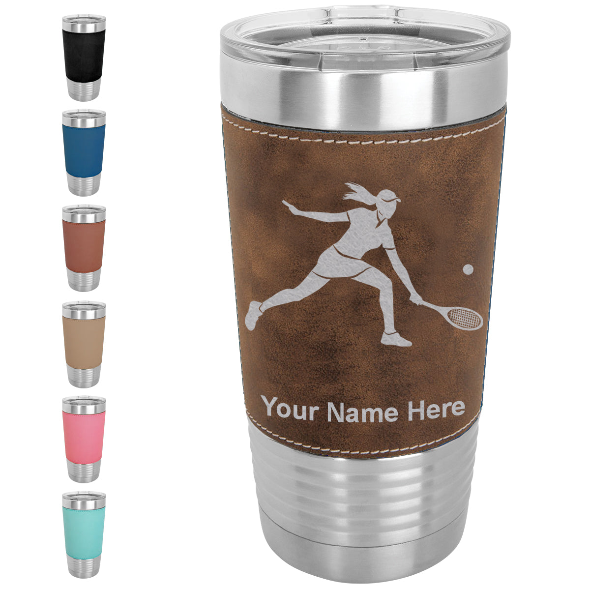 20oz Faux Leather Tumbler Mug, Tennis Player Woman, Personalized Engraving Included