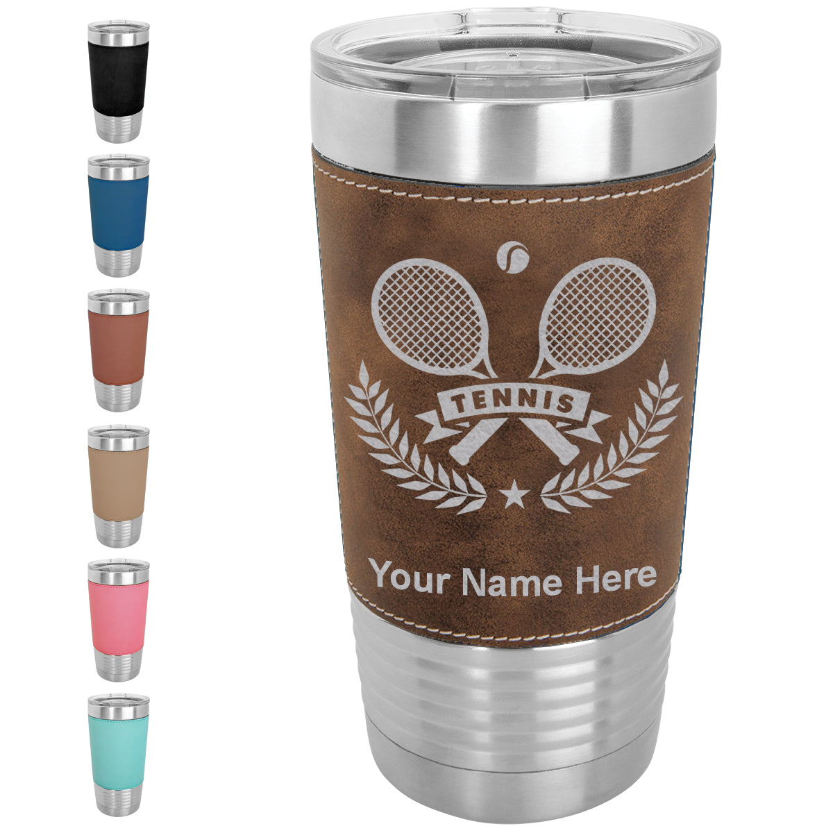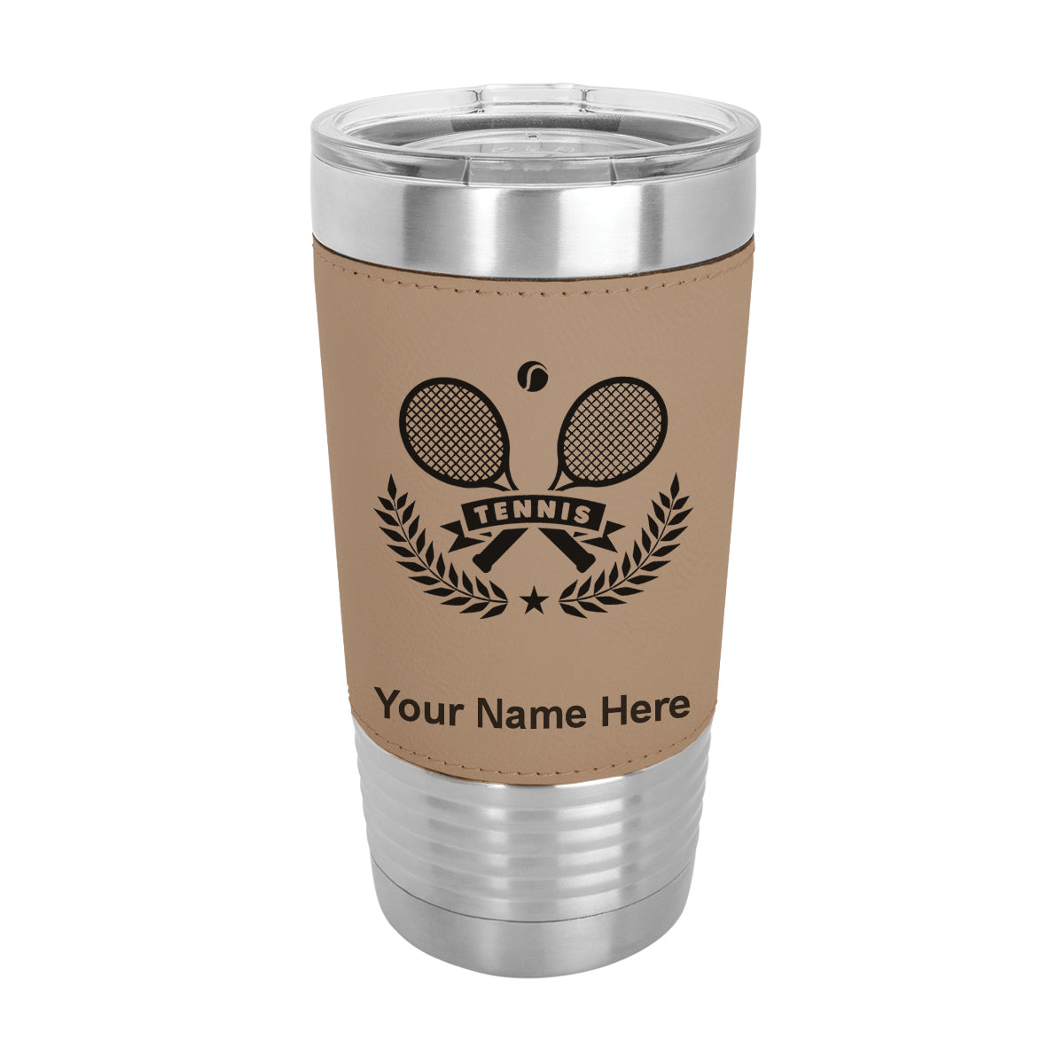 20oz Faux Leather Tumbler Mug, Tennis Rackets, Personalized Engraving Included