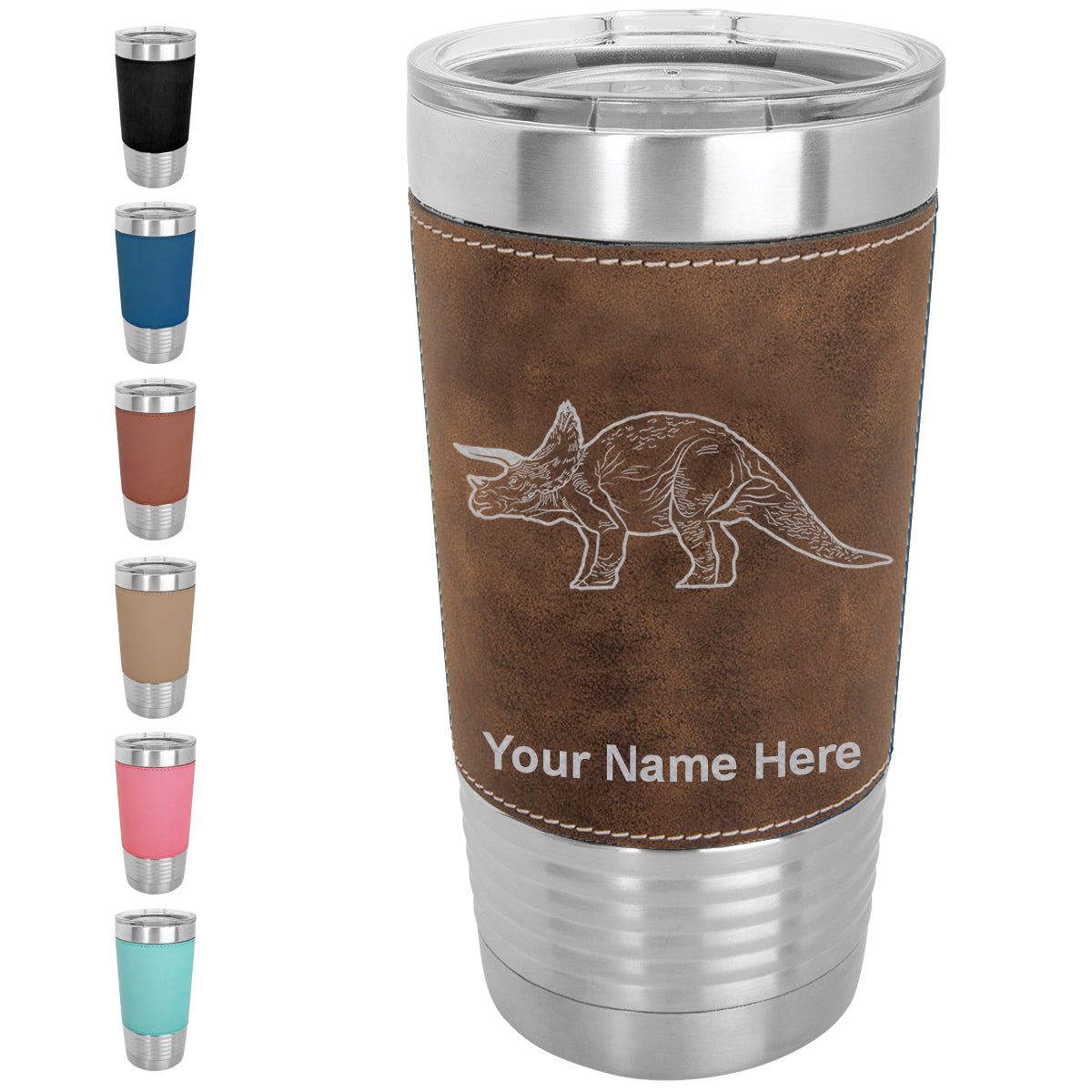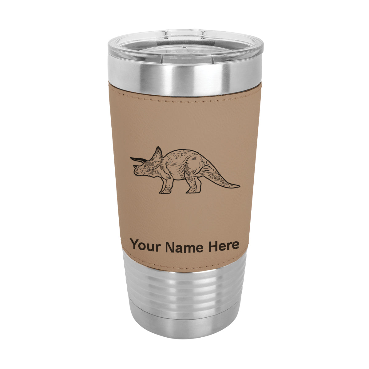 20oz Faux Leather Tumbler Mug, Triceratops Dinosaur, Personalized Engraving Included