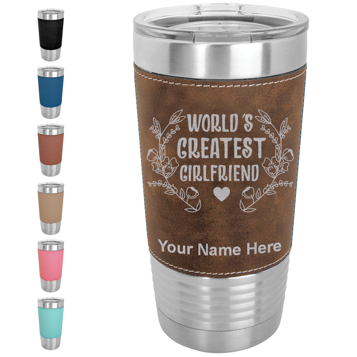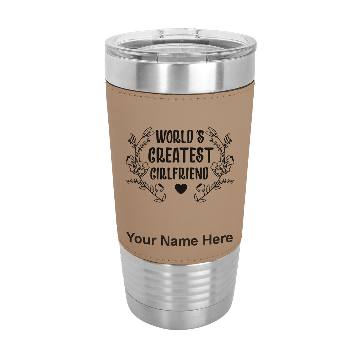 20oz Faux Leather Tumbler Mug, World's Greatest Girlfriend, Personalized Engraving Included