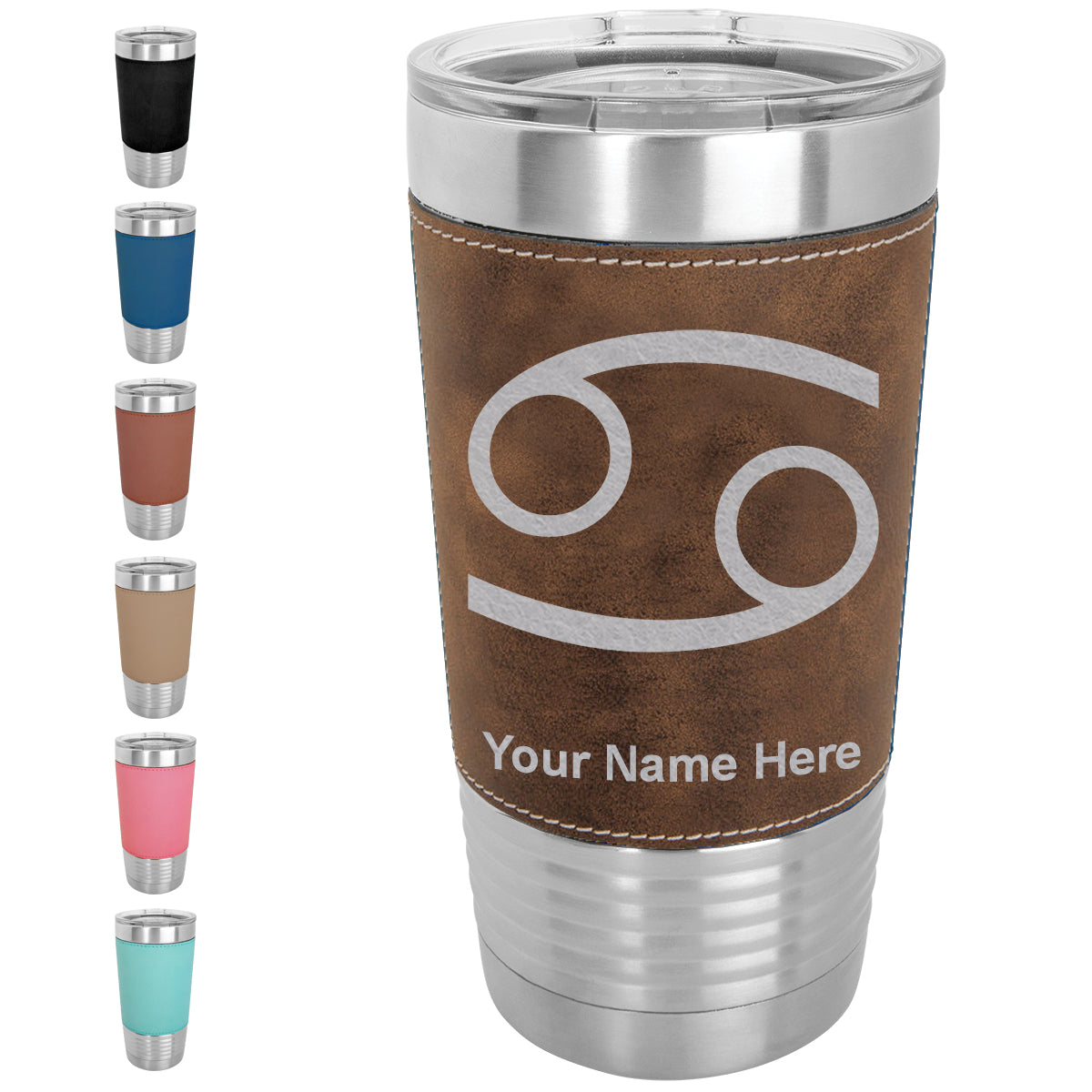 20oz Faux Leather Tumbler Mug, Zodiac Sign Cancer, Personalized Engraving Included