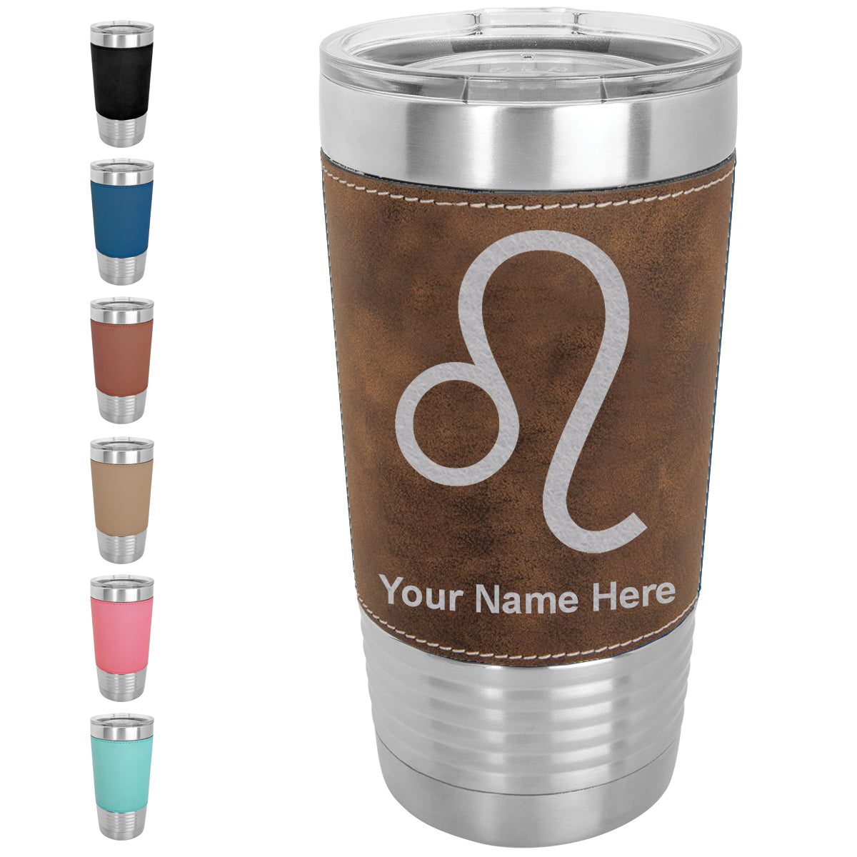 20oz Faux Leather Tumbler Mug, Zodiac Sign Leo, Personalized Engraving Included