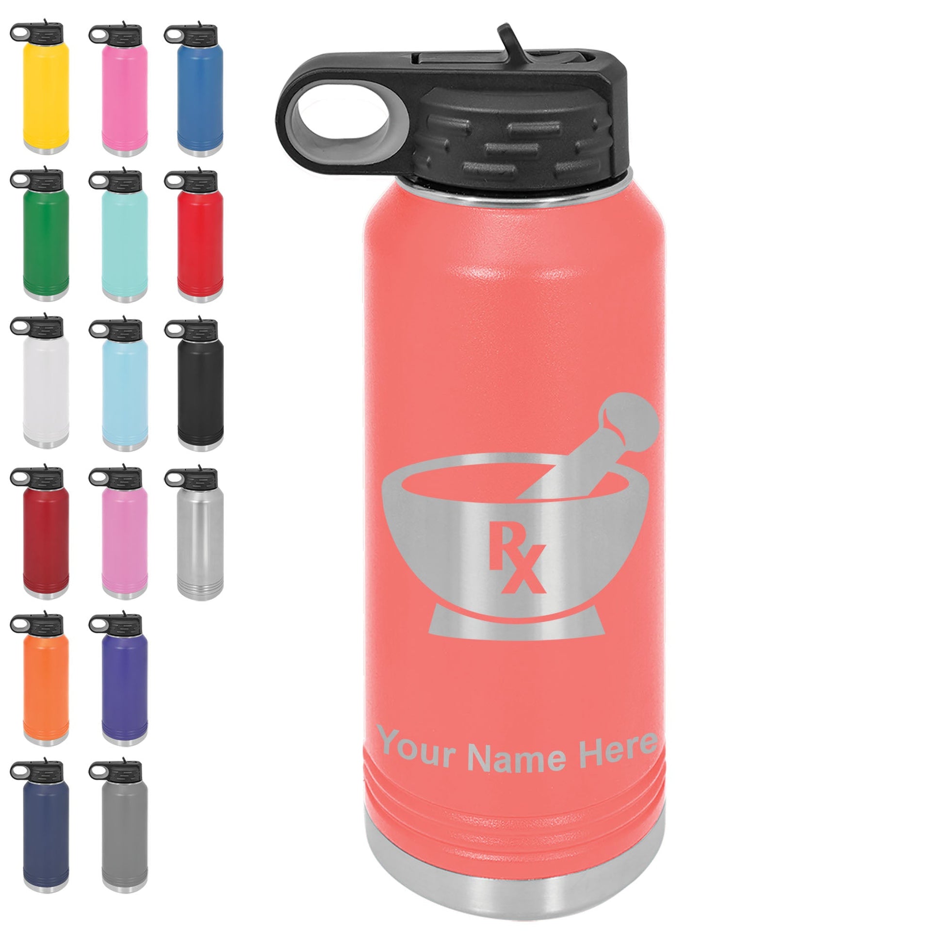 40oz Double Wall Flip Top Water Bottle with Straw, Rx Pharmacy Symbol, Personalized Engraving Included