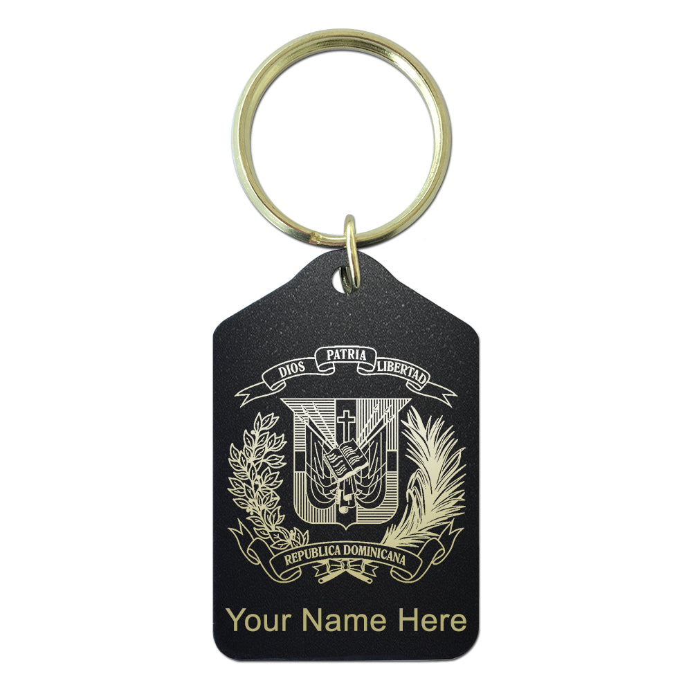 Black Metal Keychain, Coat of Arms Dominican Republic, Personalized Engraving Included