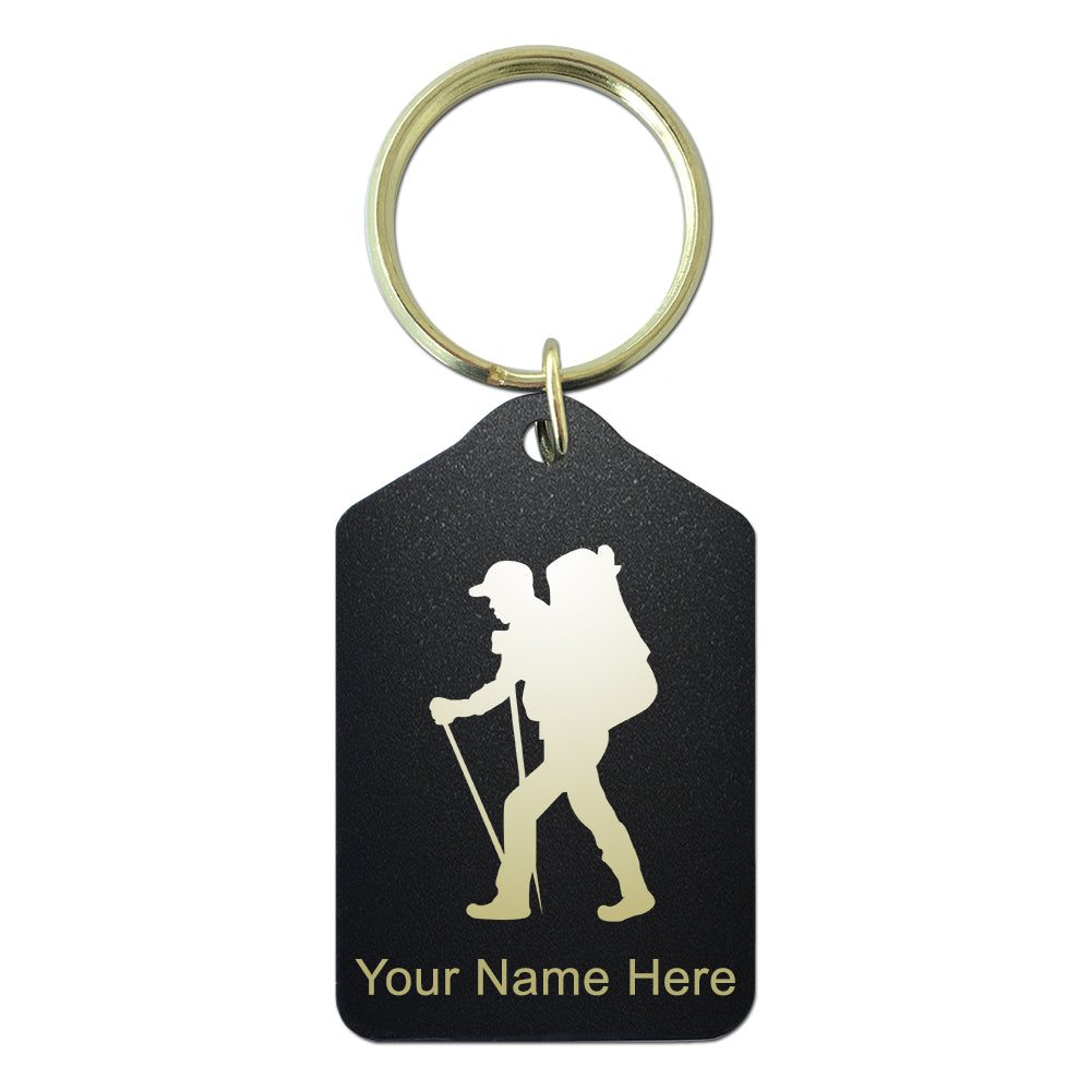 Black Metal Keychain, Hiker Man, Personalized Engraving Included