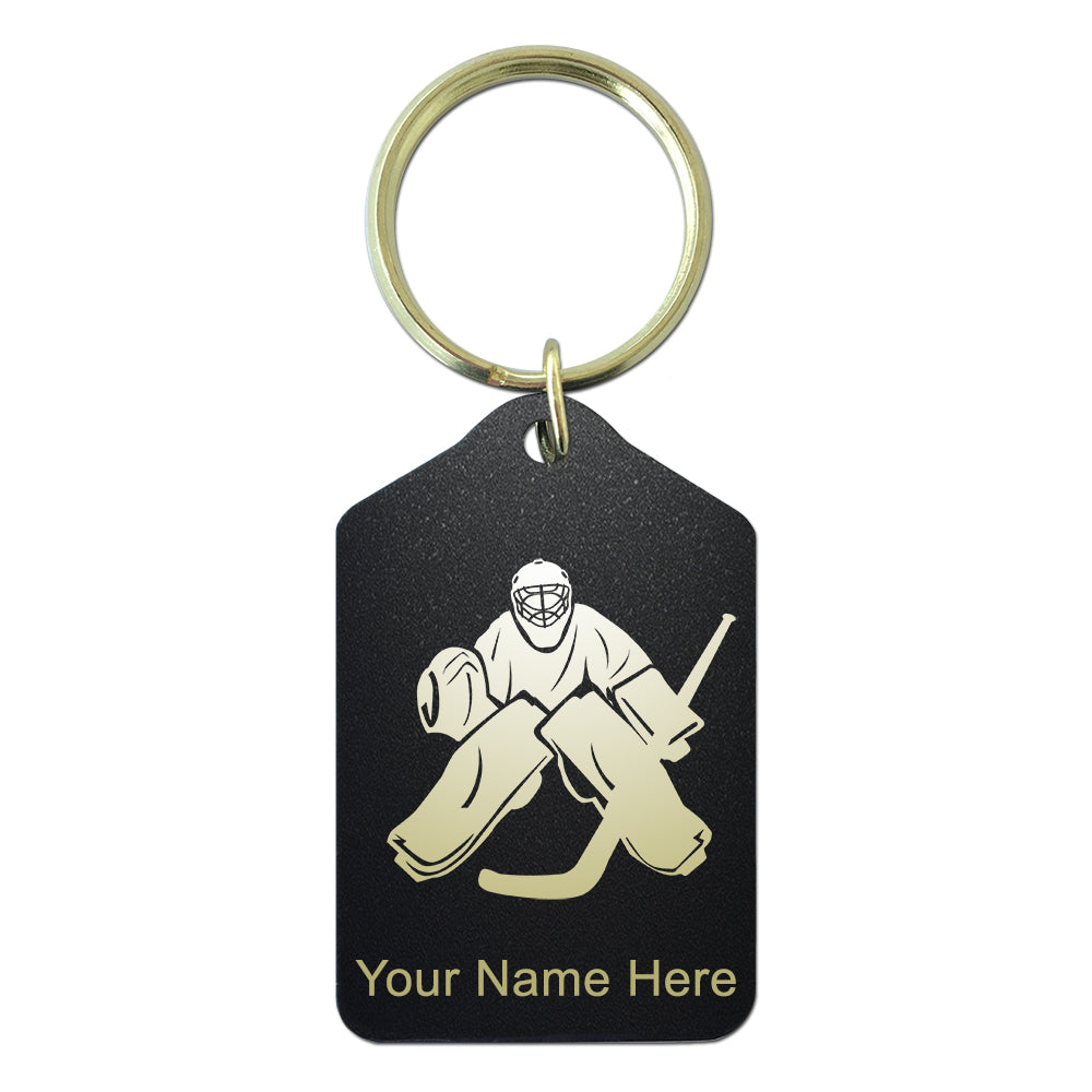 Black Metal Keychain, Hockey Goalie, Personalized Engraving Included