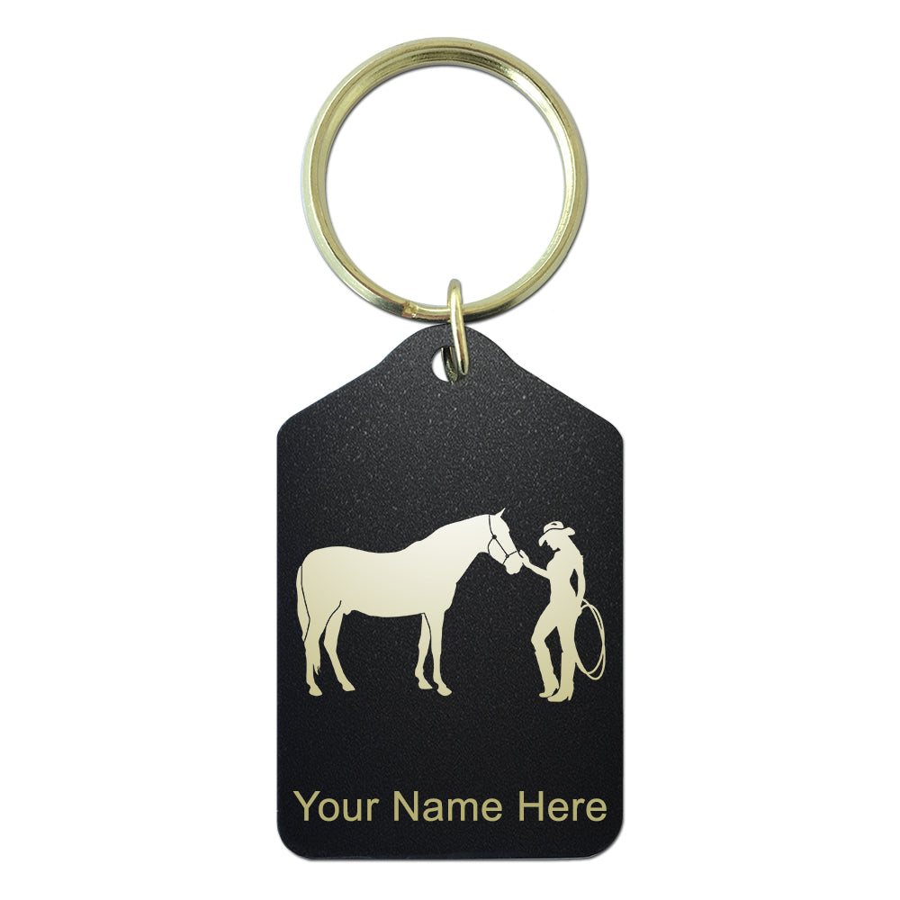 Black Metal Keychain, Horse and Cowgirl, Personalized Engraving Included