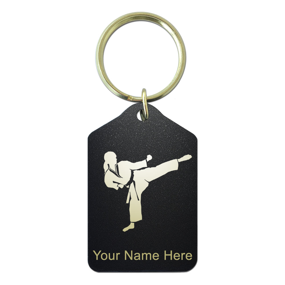 Black Metal Keychain, Karate Woman, Personalized Engraving Included