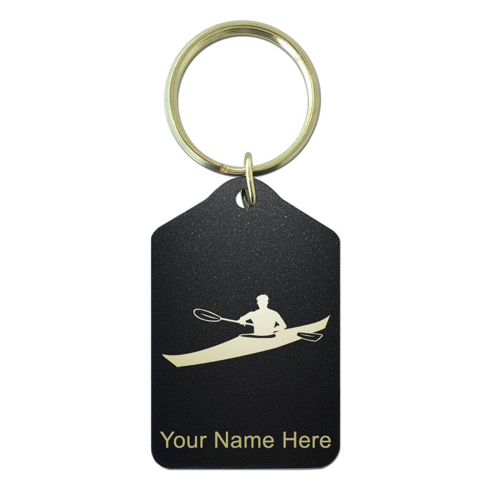 Black Metal Keychain, Kayak Man, Personalized Engraving Included