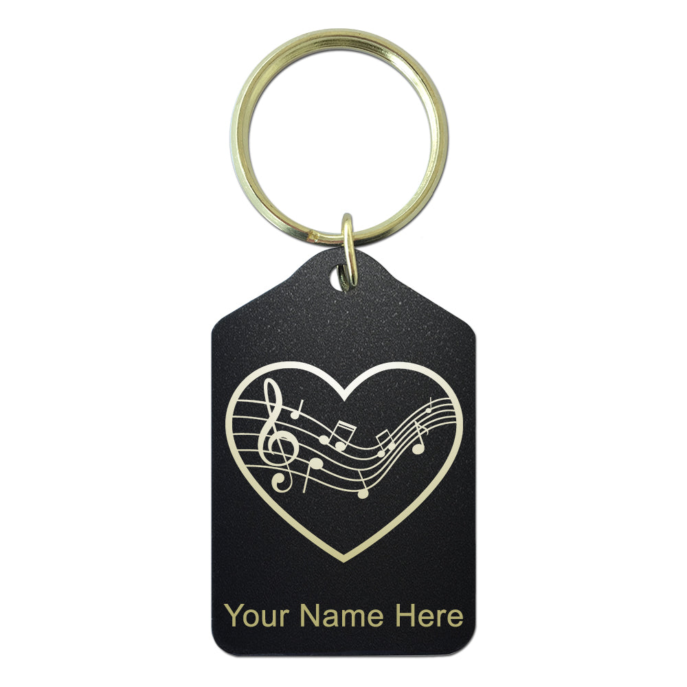 Black Metal Keychain, Music Staff Heart, Personalized Engraving Included