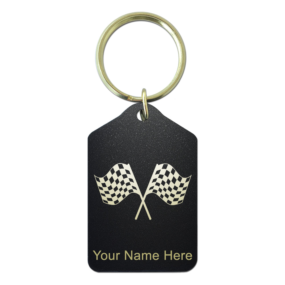 Black Metal Keychain, Racing Flags, Personalized Engraving Included