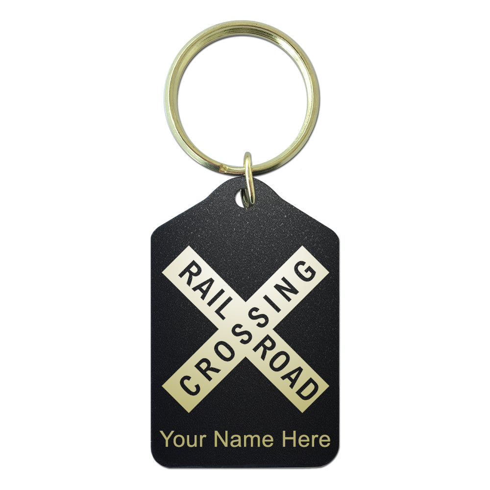 Black Metal Keychain, Railroad Crossing Sign 1, Personalized Engraving Included