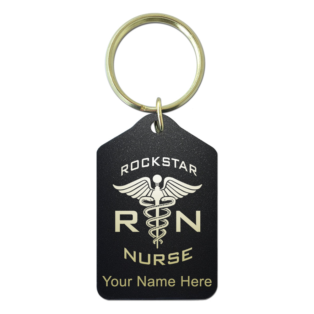 Black Metal Keychain, RN Rockstar Nurse, Personalized Engraving Included