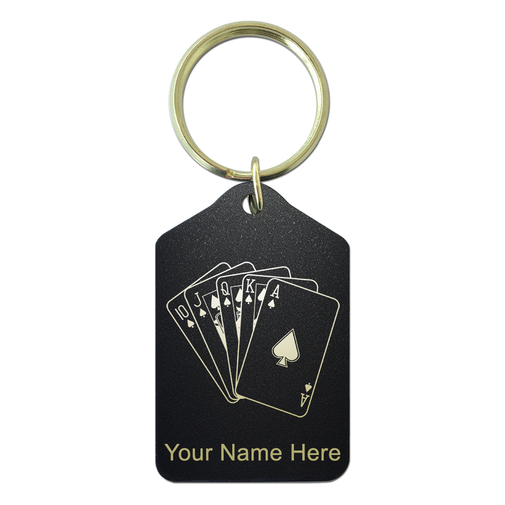 Black Metal Keychain, Royal Flush Poker Cards, Personalized Engraving Included