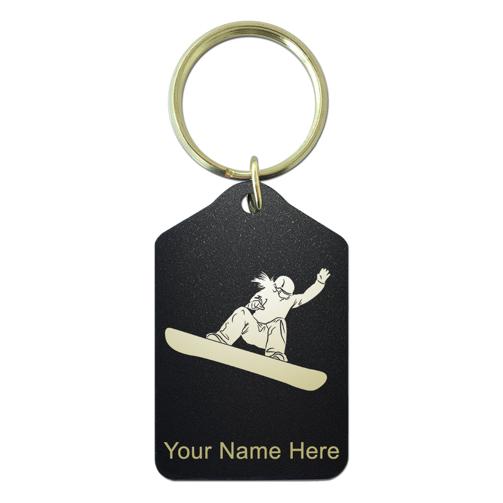 Black Metal Keychain, Snowboarder Woman, Personalized Engraving Included