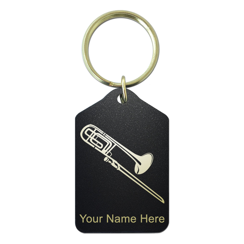 Black Metal Keychain, Trombone, Personalized Engraving Included