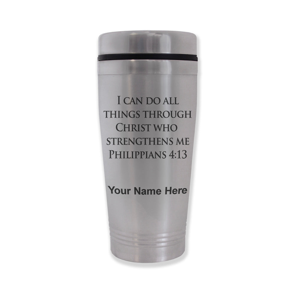 Commuter Travel Mug, Bible Verse Philippians 4-13, Personalized Engraving Included