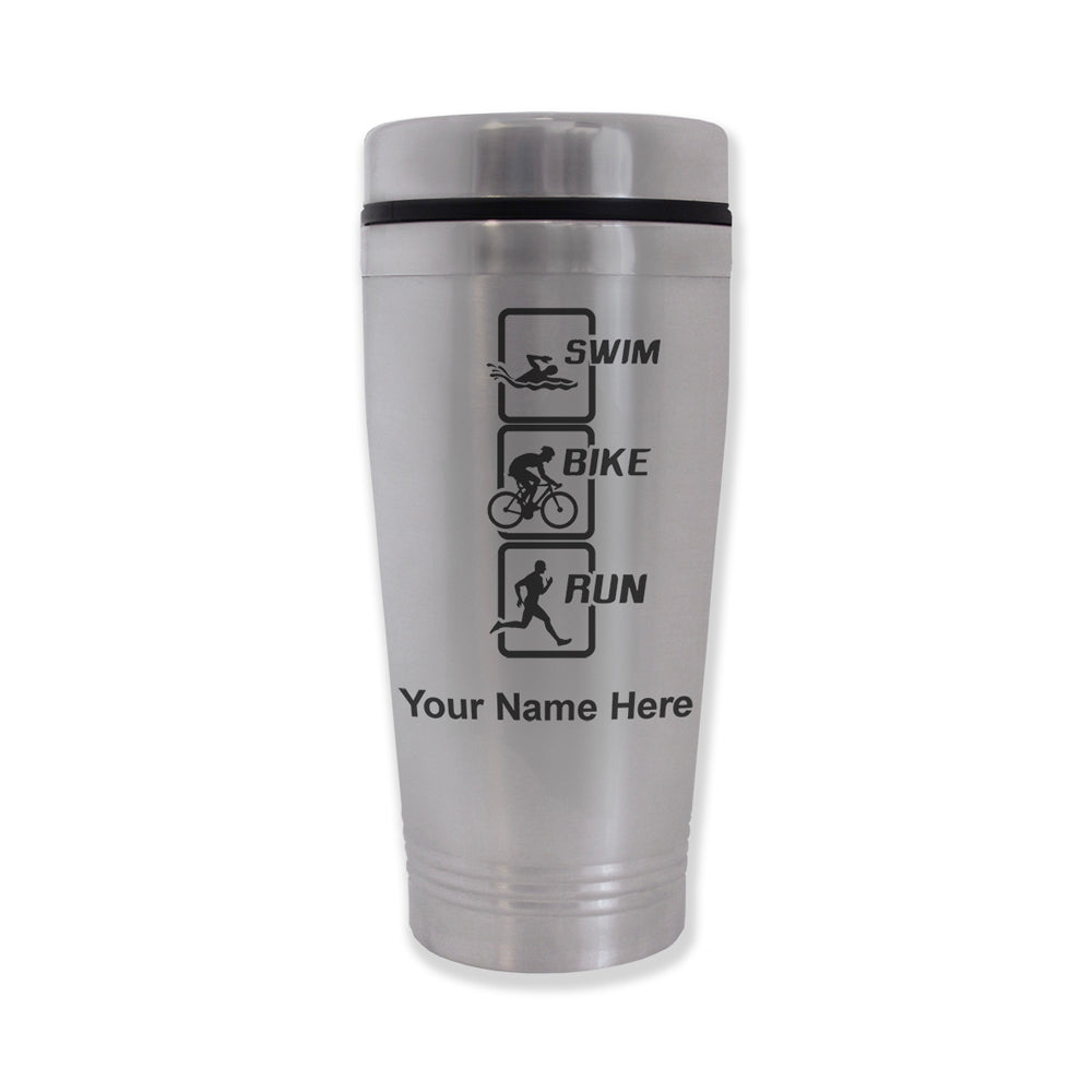 Commuter Travel Mug, Swim Bike Run Vertical, Personalized Engraving Included