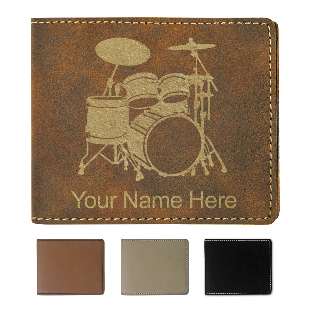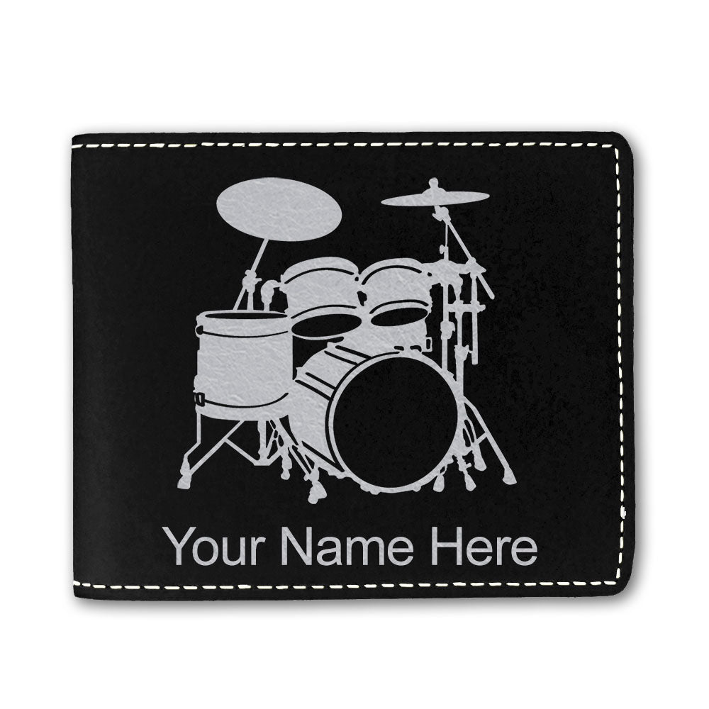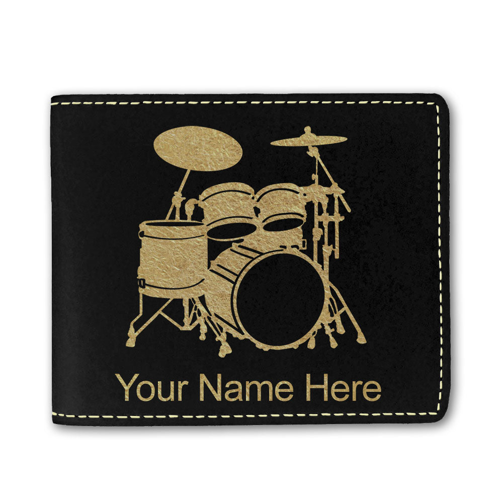 Faux Leather Bi-Fold Wallet, Drum Set, Personalized Engraving Included