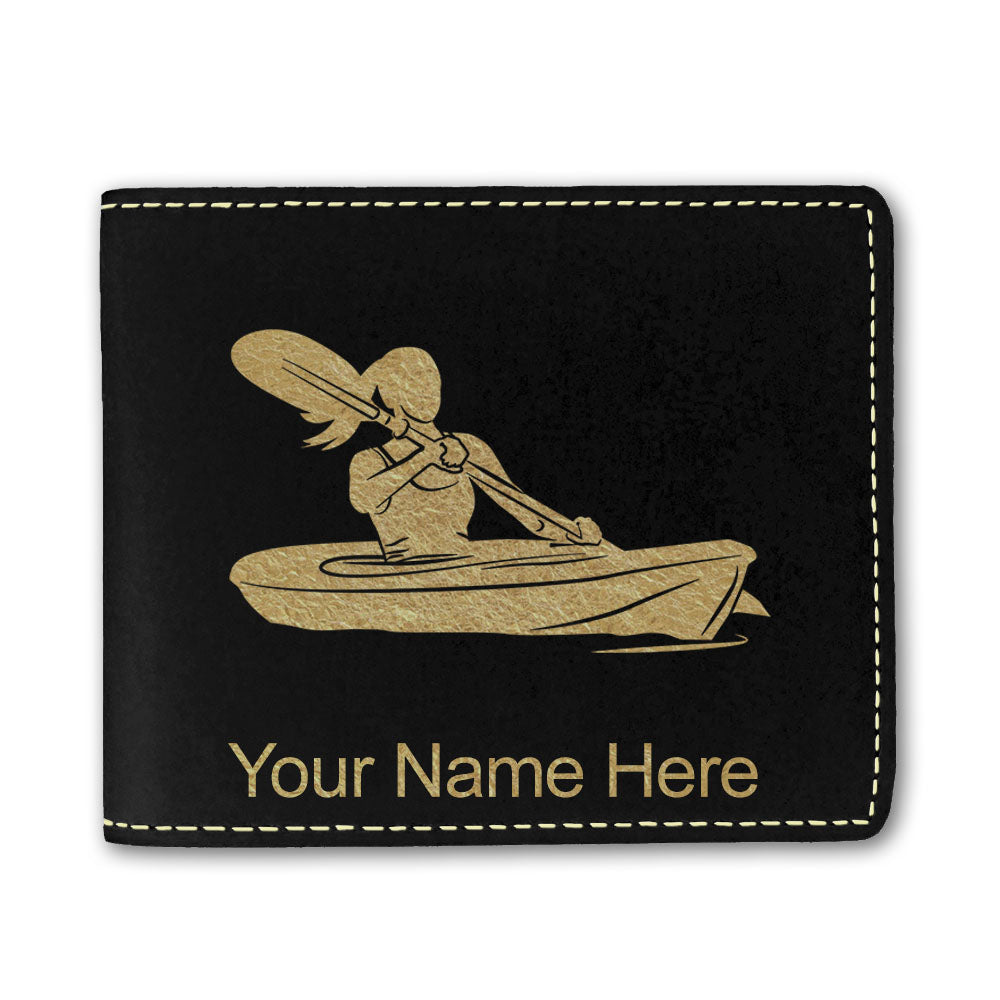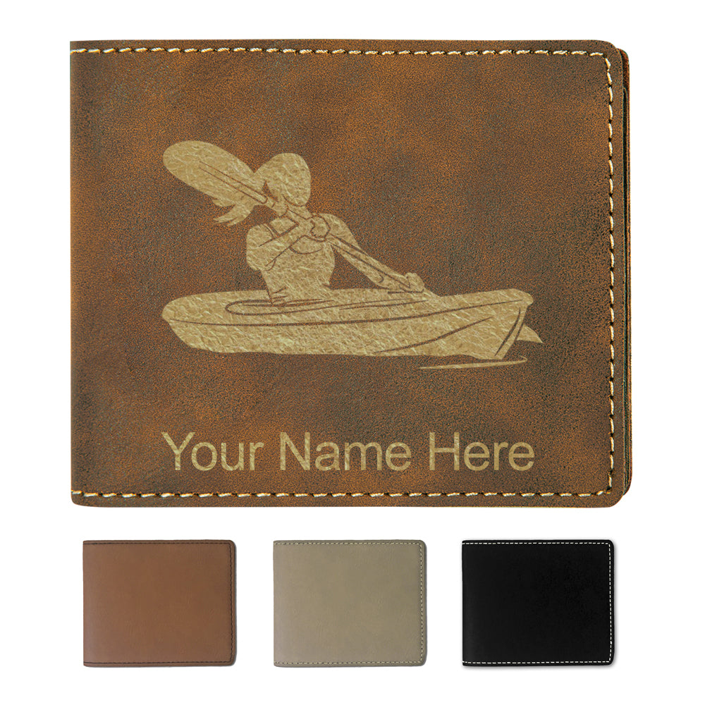 Faux Leather Bi-Fold Wallet, Kayak Woman, Personalized Engraving Included
