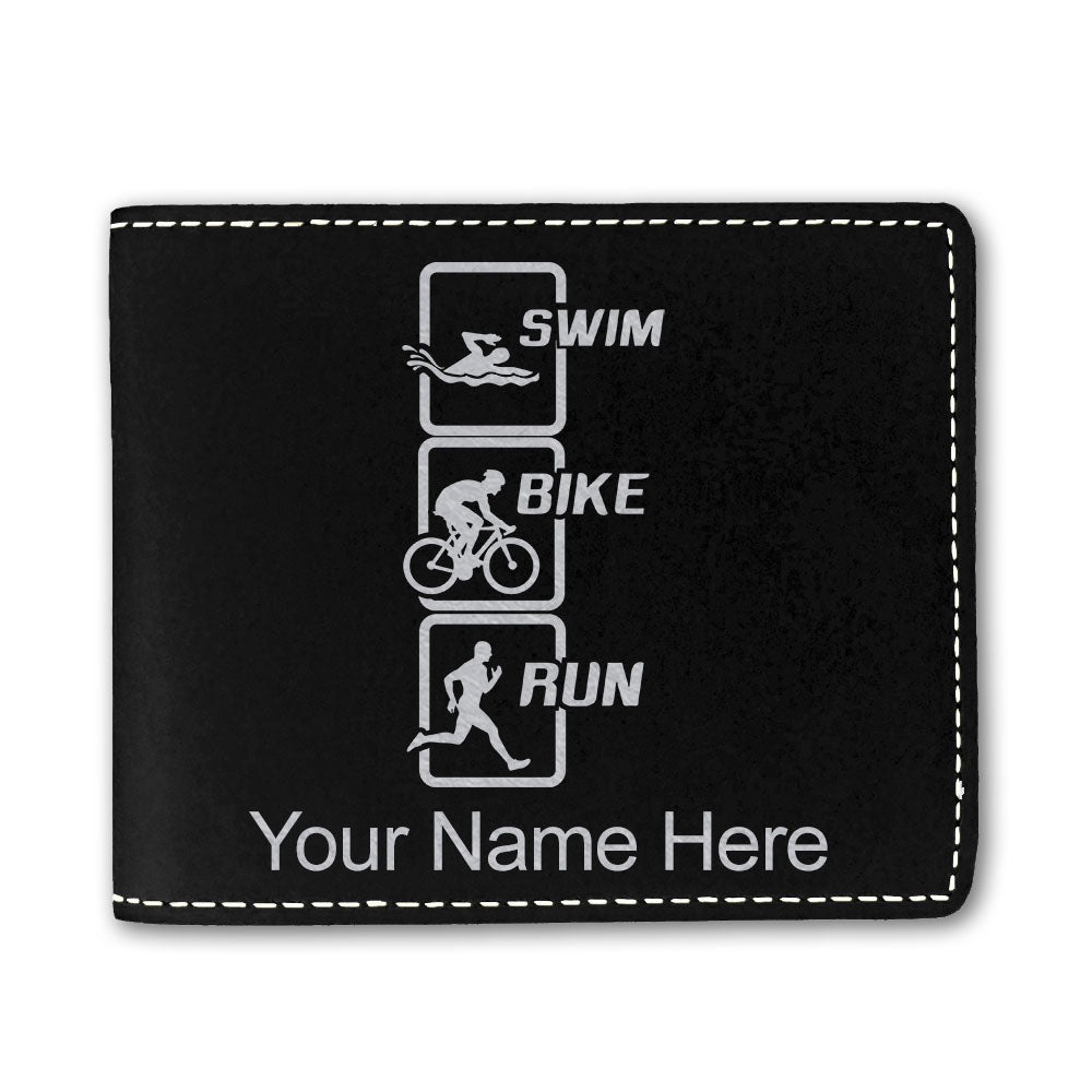 Faux Leather Bi-Fold Wallet, Swim Bike Run Vertical, Personalized Engraving Included