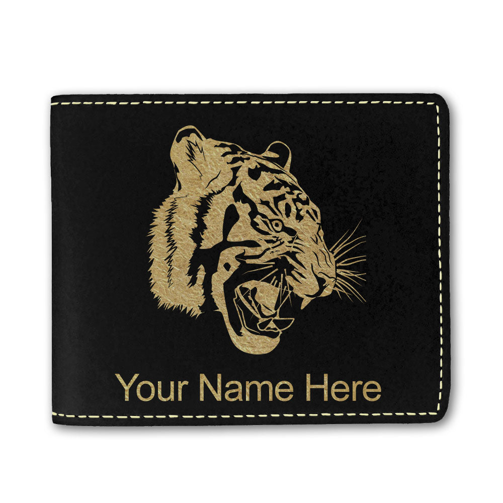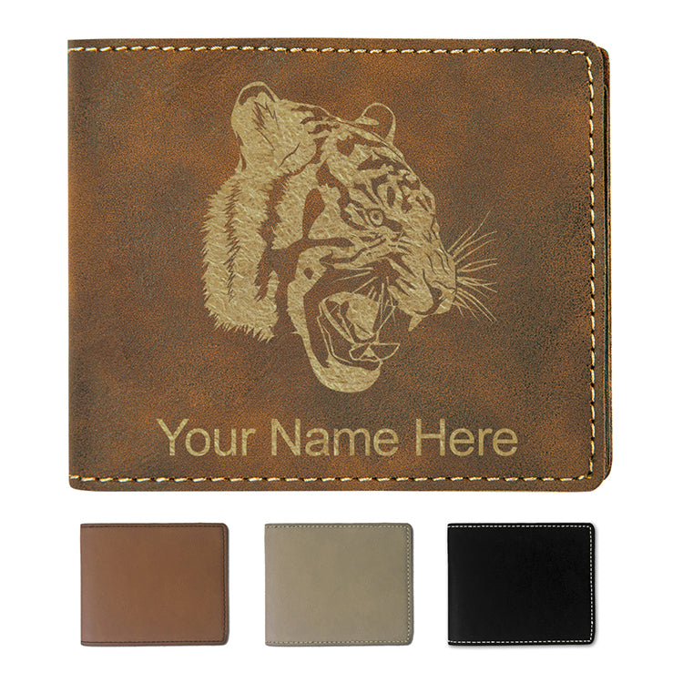 Faux Leather Bi-Fold Wallet, Tiger Head, Personalized Engraving Included