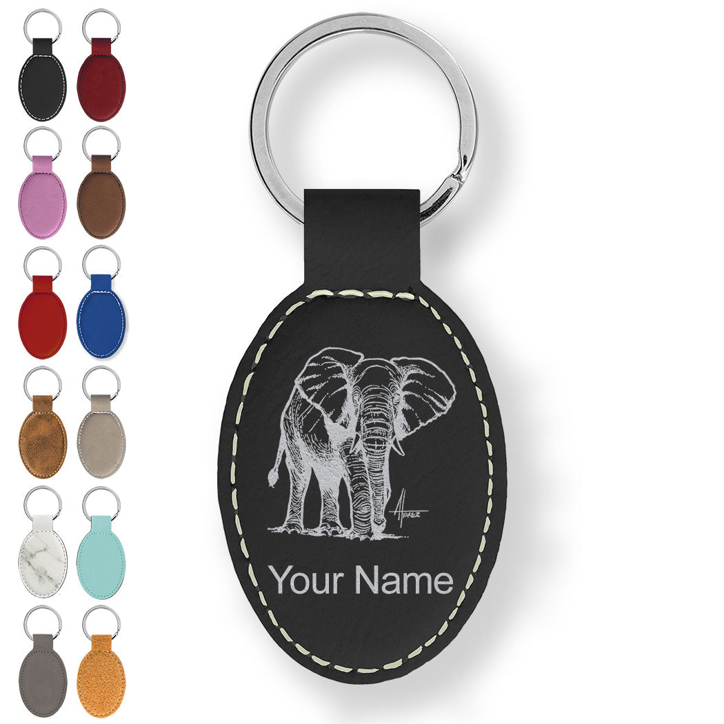 Faux Leather Oval Keychain, African Elephant, Personalized Engraving Included