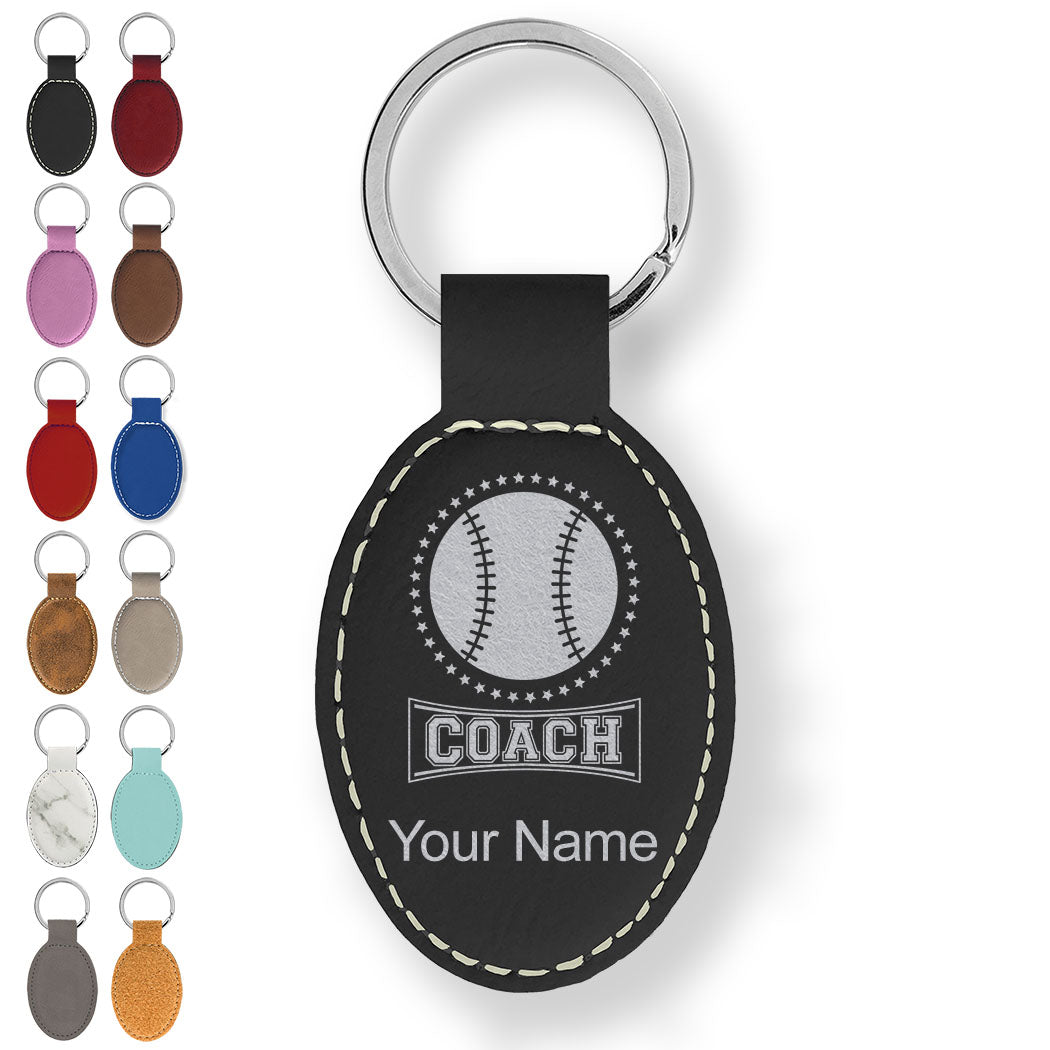 Faux Leather Oval Keychain, Baseball Coach, Personalized Engraving Included