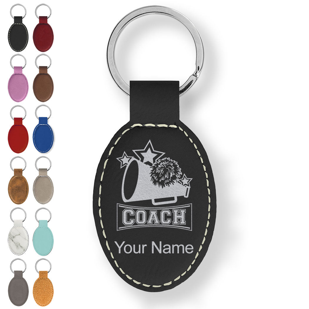 Faux Leather Oval Keychain, Cheerleading Coach, Personalized Engraving Included
