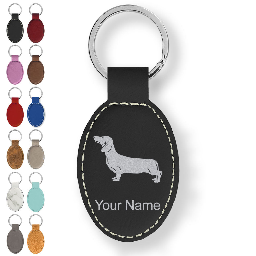 Faux Leather Oval Keychain, Dachshund Dog, Personalized Engraving Included