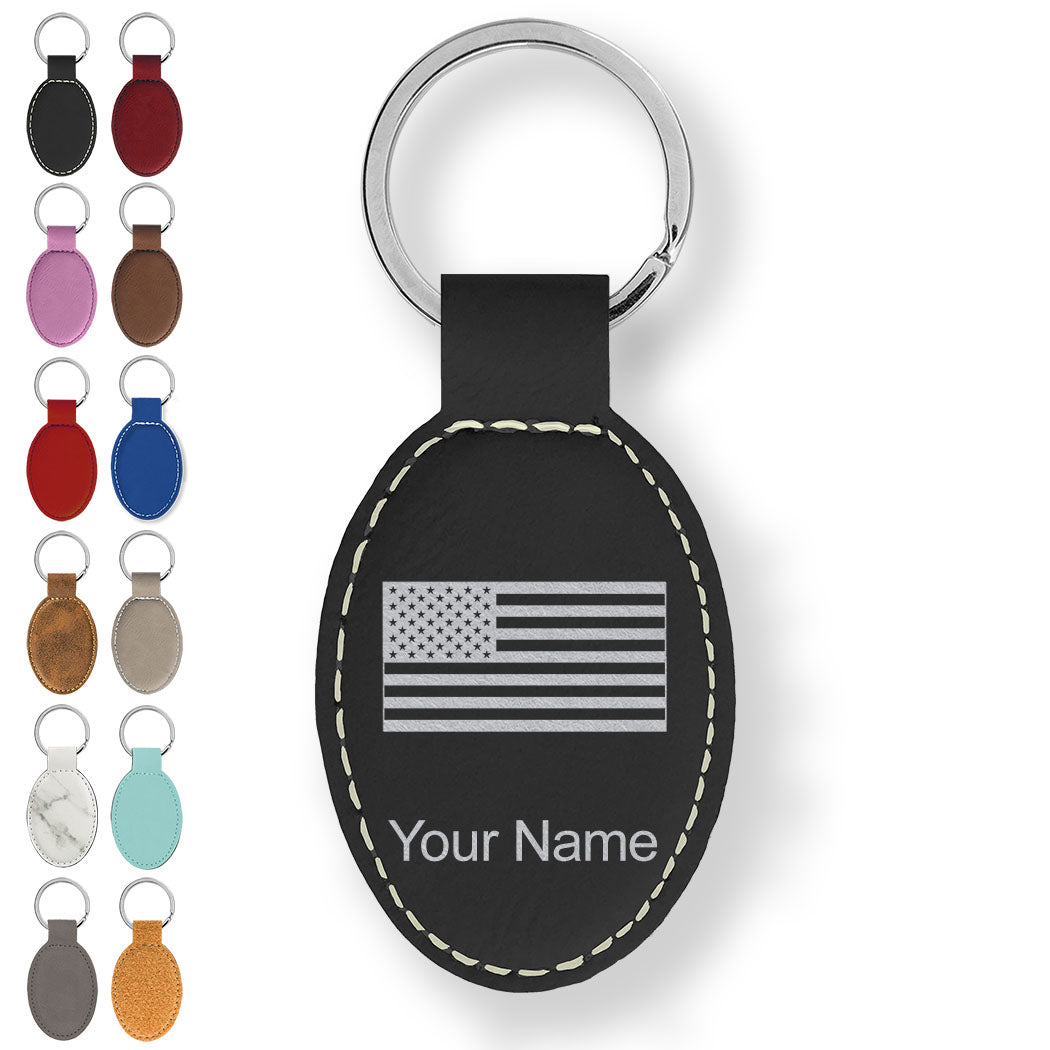 Faux Leather Oval Keychain, Flag of the United States, Personalized Engraving Included