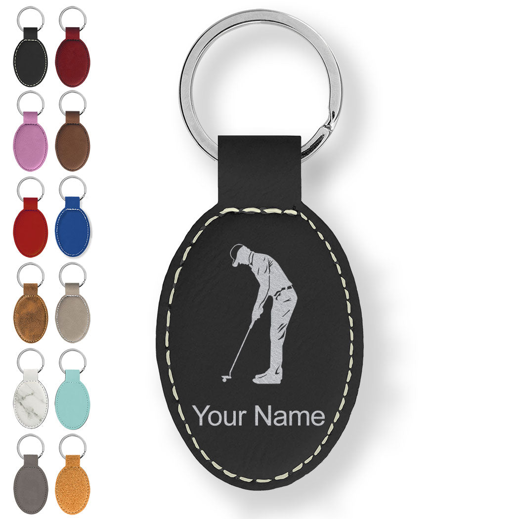 Faux Leather Oval Keychain, Golfer Putting, Personalized Engraving Included