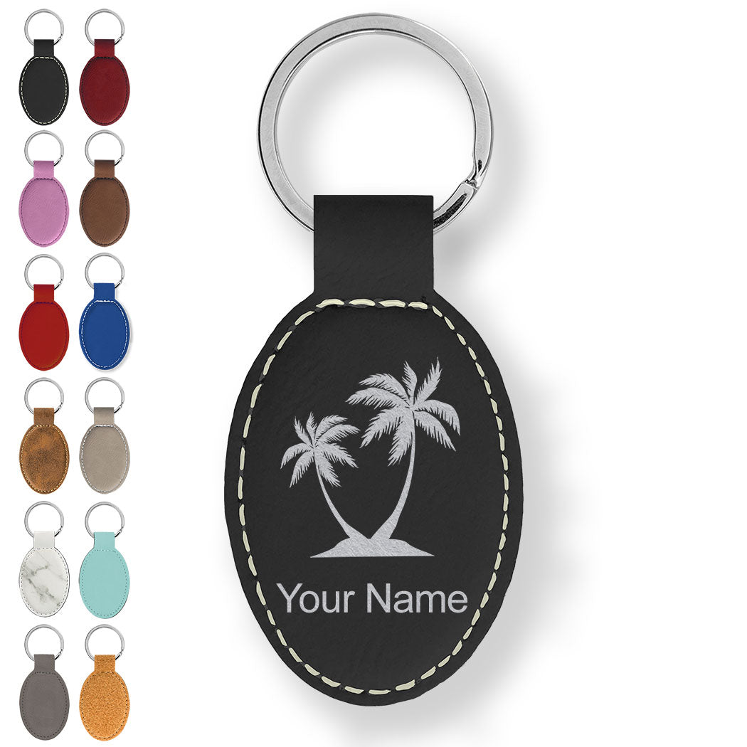 Faux Leather Oval Keychain, Palm Trees, Personalized Engraving Included