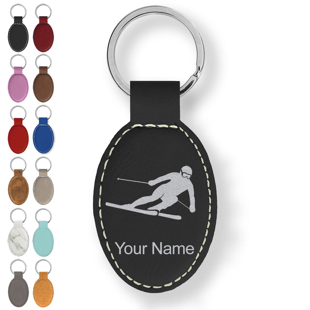 Faux Leather Oval Keychain, Skier Downhill, Personalized Engraving Included