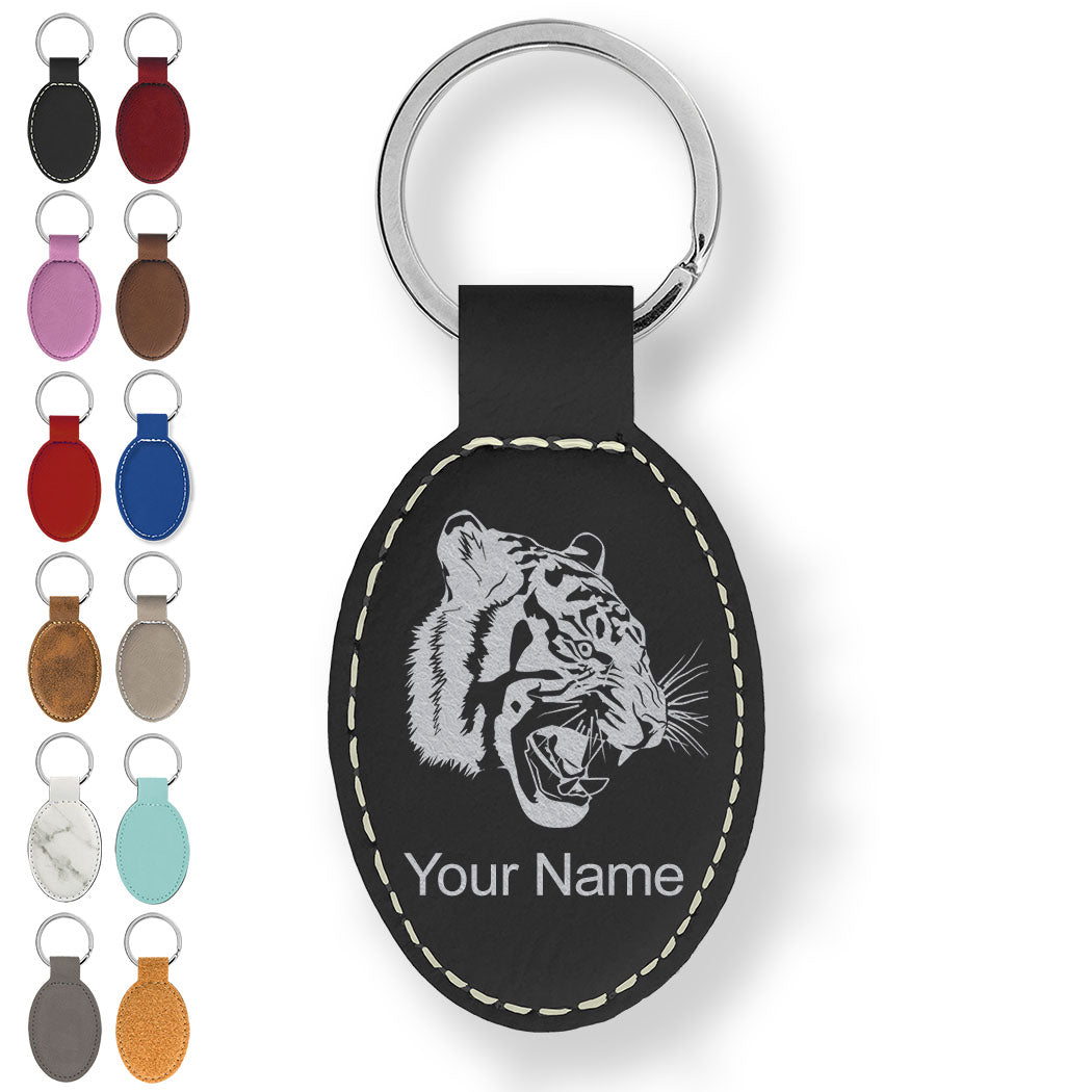 Faux Leather Oval Keychain, Tiger Head, Personalized Engraving Included