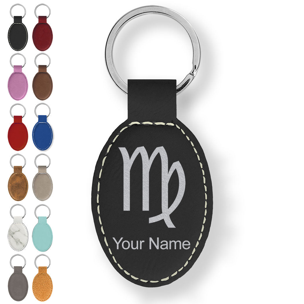 Faux Leather Oval Keychain, Zodiac Sign Virgo, Personalized Engraving Included