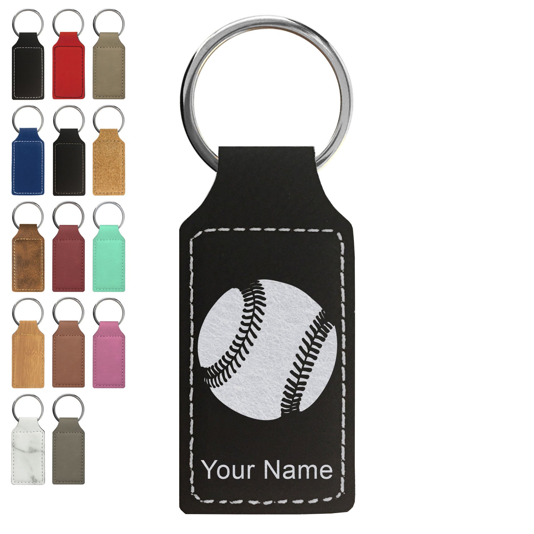 Faux Leather Rectangle Keychain, Baseball Ball, Personalized Engraving Included