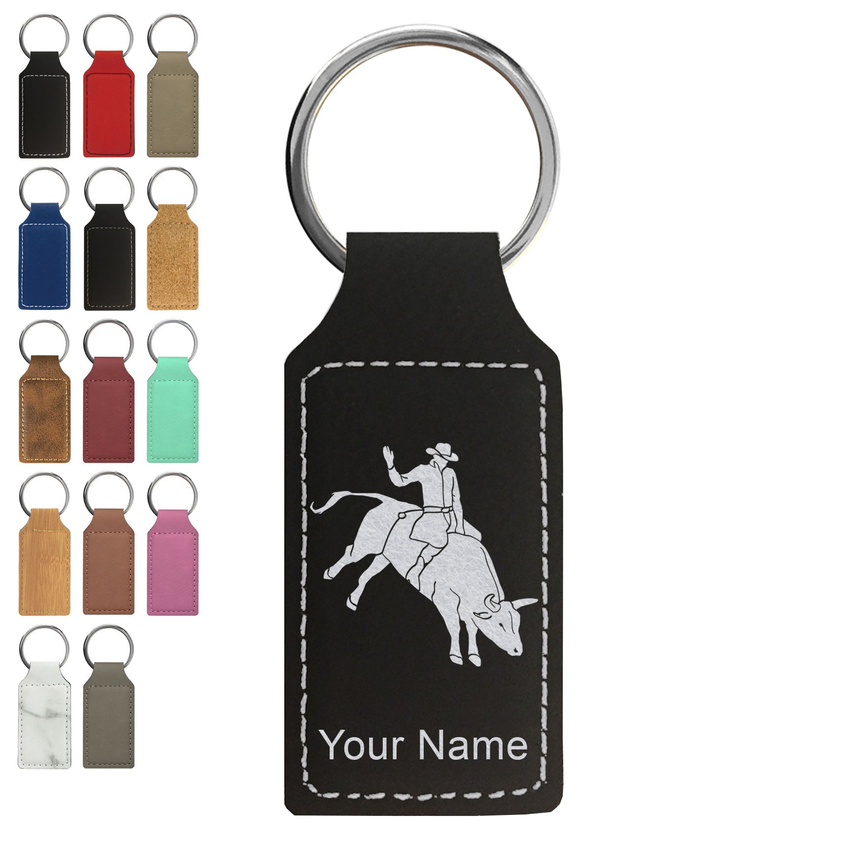 Faux Leather Rectangle Keychain, Bull Rider Cowboy, Personalized Engraving Included