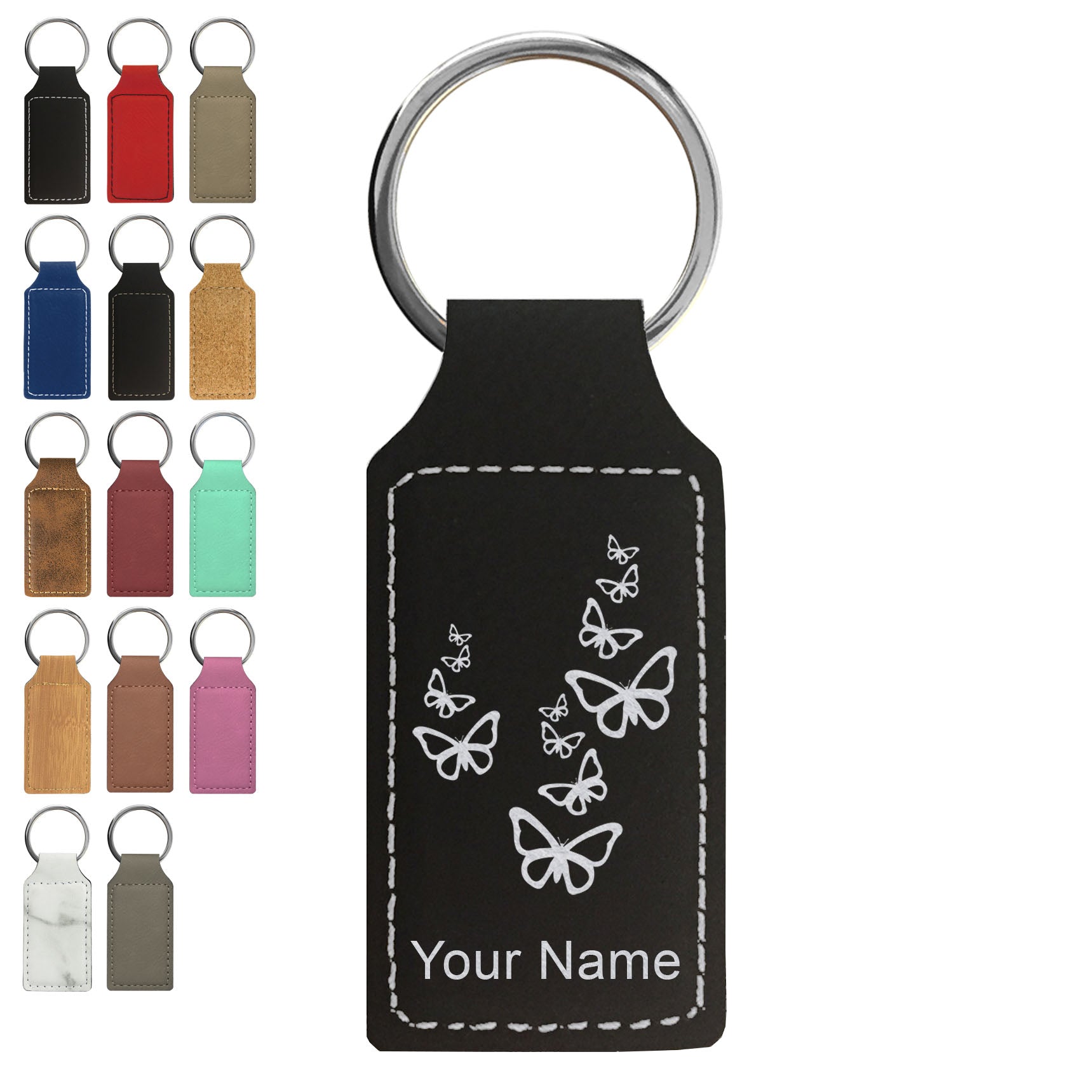 Faux Leather Rectangle Keychain, Butterflies, Personalized Engraving Included