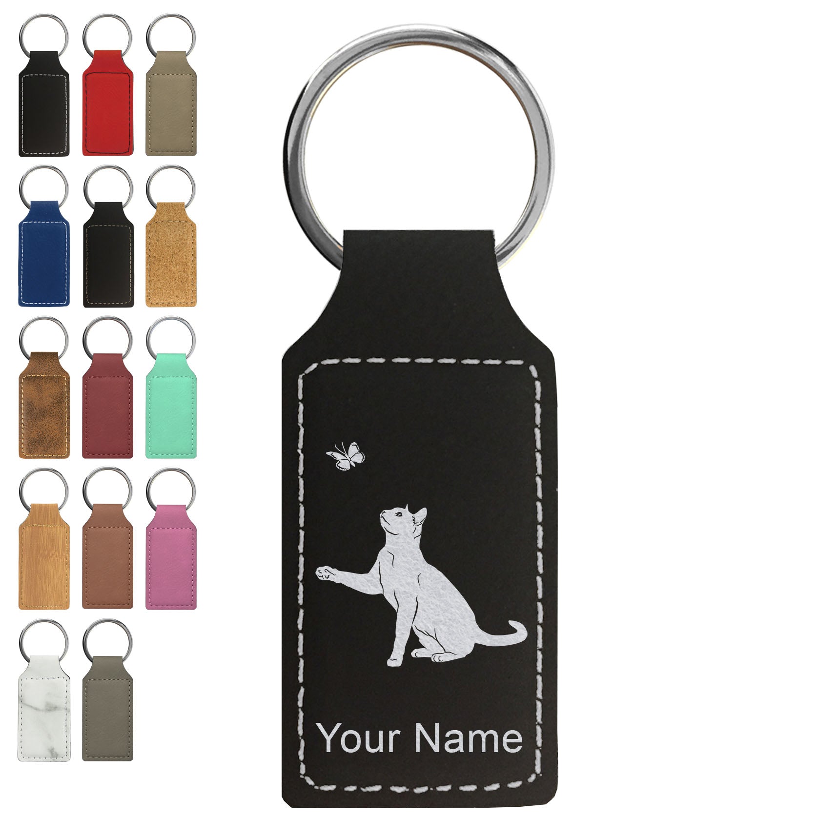 Faux Leather Rectangle Keychain, Cat with Butterfly, Personalized Engraving Included