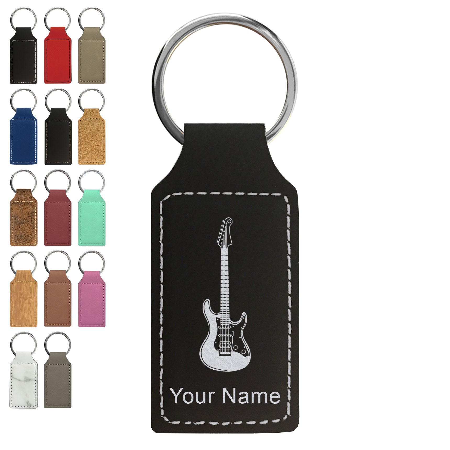 Faux Leather Rectangle Keychain, Electric Guitar, Personalized Engraving Included