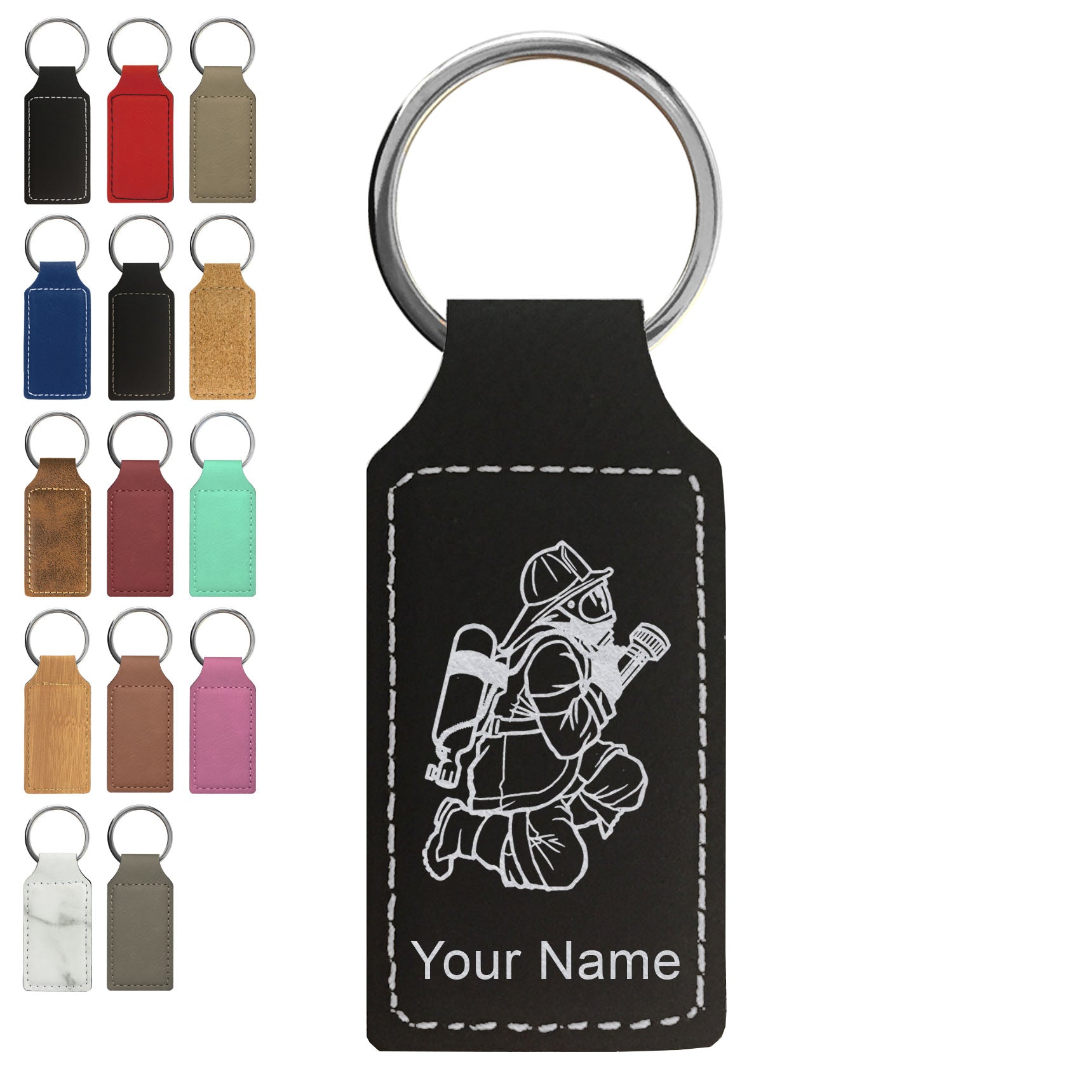 Faux Leather Rectangle Keychain, Fireman with Hose, Personalized Engraving Included