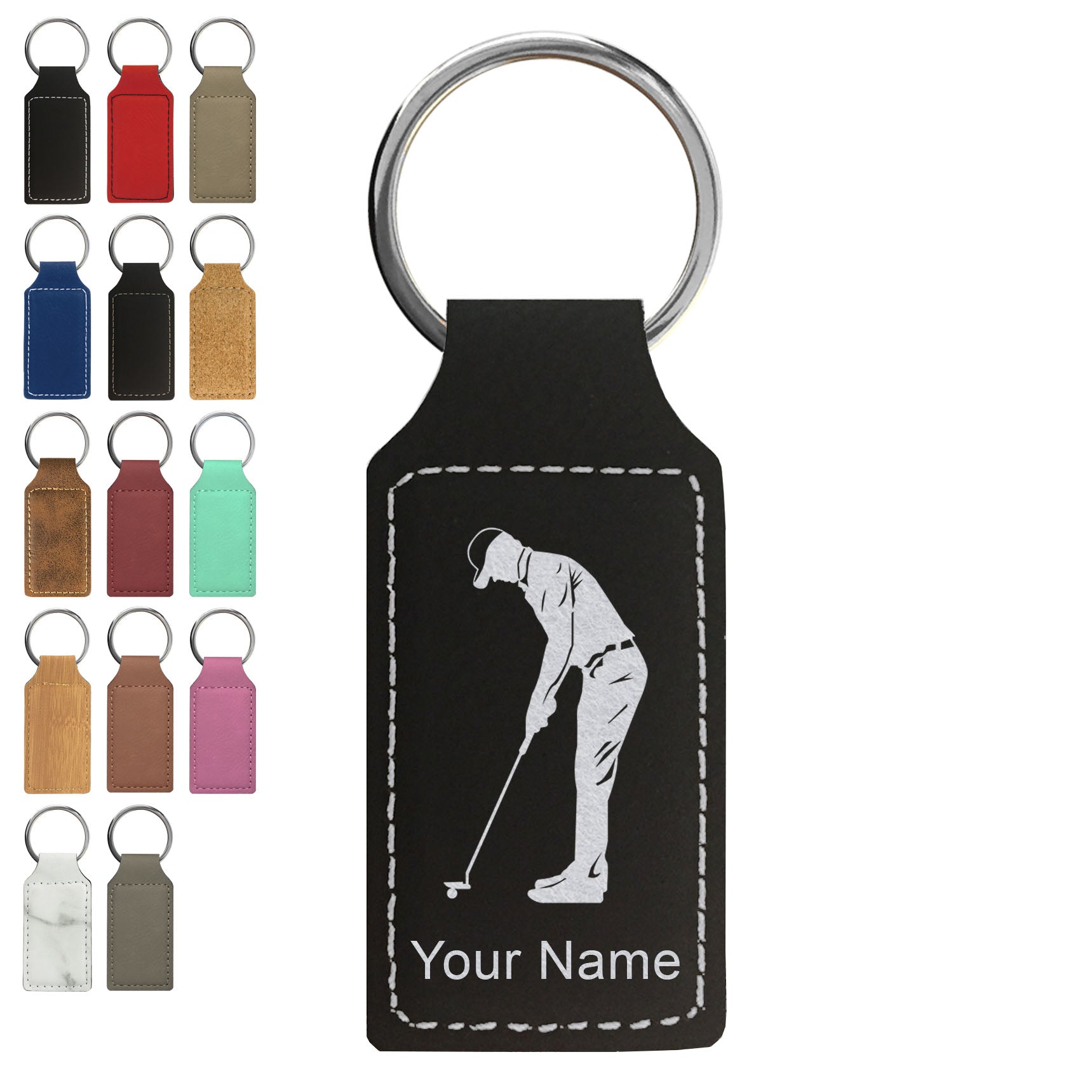 Faux Leather Rectangle Keychain, Golfer Putting, Personalized Engraving Included