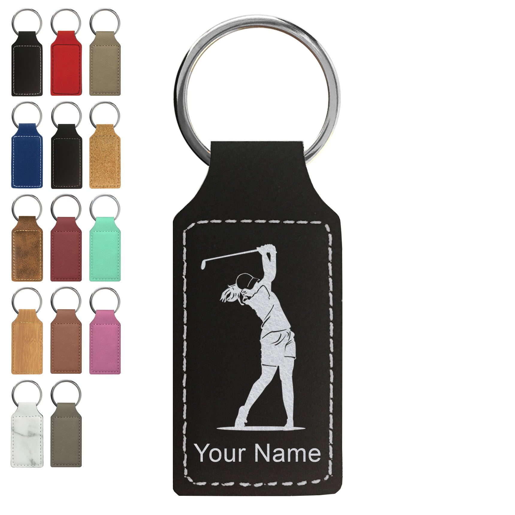 Faux Leather Rectangle Keychain, Golfer Woman, Personalized Engraving Included