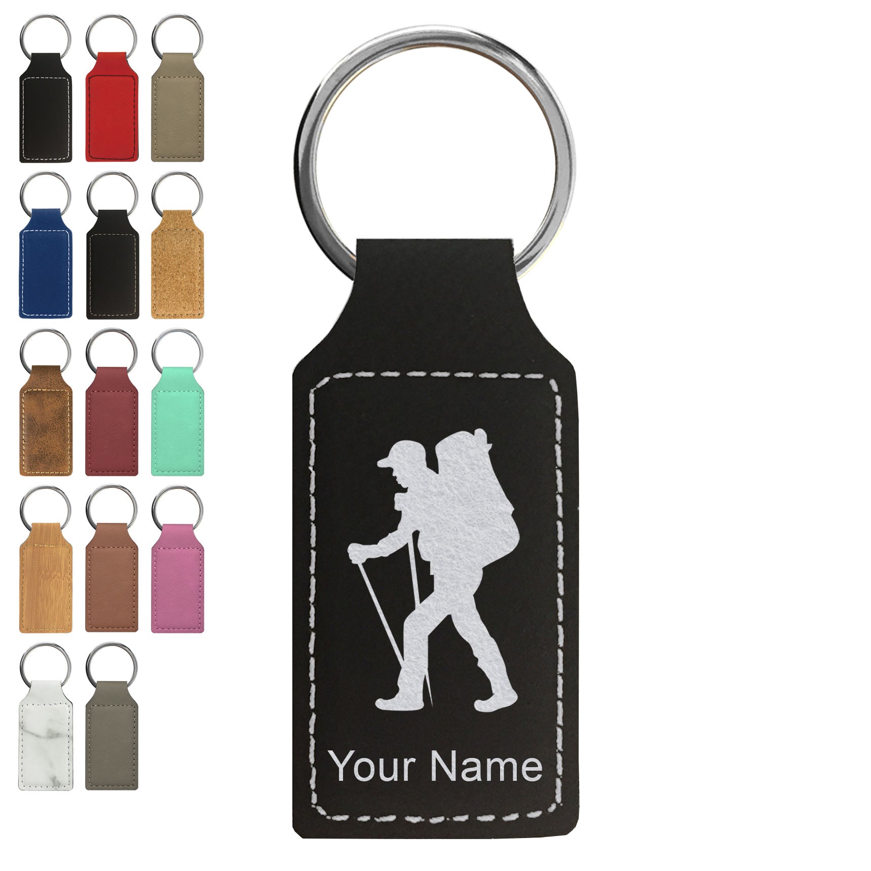 Faux Leather Rectangle Keychain, Hiker Man, Personalized Engraving Included
